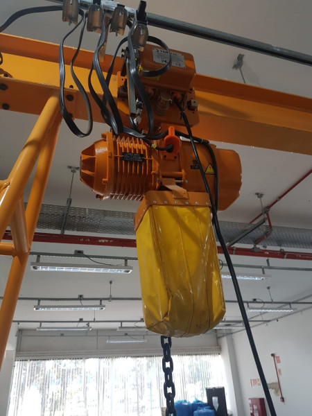 Talha elétrica de corrente ou de cabos de aço, com elevações de 3 a 40 metros, tensão trifásica 220/380V ou 440V. Operada por botoeira de comando ou controle remoto, pode ser fornecida com ou sem carro trole, para instalação em monovias, pórticos móveis ou ponte rolante.